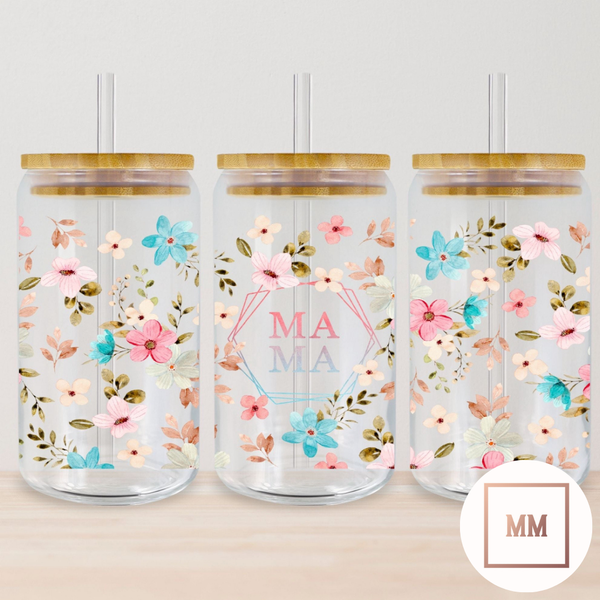 This 16oz Mama Floral Glass Cup features a charming design of pink and blue flowers. The delicate floral pattern adds a touch of elegance to your beverage experience. Crafted with quality glass, this cup is the perfect addition to any kitchen.