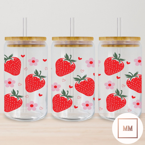 This 16oz glass cup features delicate strawberries and pink flowers. With its beautiful design, this cup is perfect for enjoying your favorite beverages while adding a touch of nature to your day. Made of high-quality glass, it is both durable and elegant. Add a touch of sweetness to your day with this Strawberry Season Glass Cup.