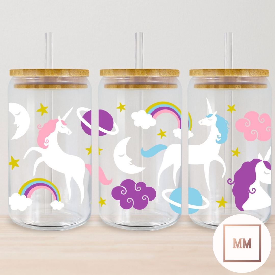 Indulge in a magical experience with our 16oz Unicorns & Rainbows Glass Cup. Adorned with dreamy clouds, colorful rainbows, sparkling stars, and majestic unicorns, this cup will bring joy and wonder to any drink. Made of sturdy glass, it is perfect for on-the-go adventures or relaxing at home. Elevate your sipping game with this enchanting cup.