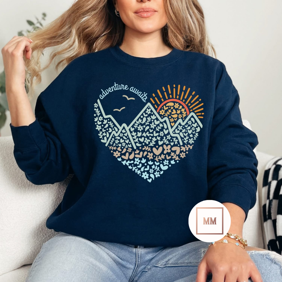 Explore the great outdoors with the Adventure Awaits Sweatshirt. Emblazoned with a heart, sun, and mountains, this cozy sweatshirt is perfect for any adventure. Stay warm and stylish while you discover new places and make memories that will last a lifetime.