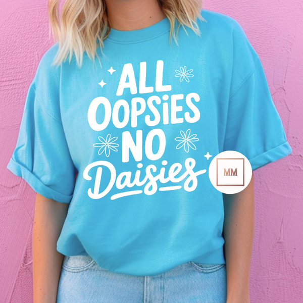 Discover the perfect balance of style and comfort with our All Oopsies No Daisies Tee. This blue tee offers a sleek and versatile look, perfect for any occasion. Made with high-quality materials, it will keep you feeling comfortable all day long. Upgrade your wardrobe with our must-have tee now.