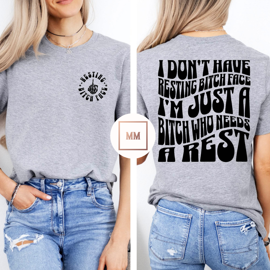 The B Who Needs a Rest Tee is made for those who face the struggle of RBF and need a break. Its comfortable and casual design offers a much-needed physical and emotional rest, while its statement print adds a touch of humor. Perfect for any self-proclaimed B looking for a moment of relaxation.
