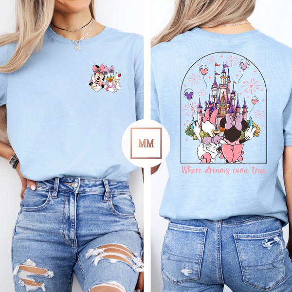 Experience the magic and wonder of childhood with the Baby Blue Where Dreams Come True Tee. Adorned with beloved mouse and duck characters, this shirt is perfect for any young girl's wardrobe. Let your little one's imagination run wild with this playful and whimsical design.