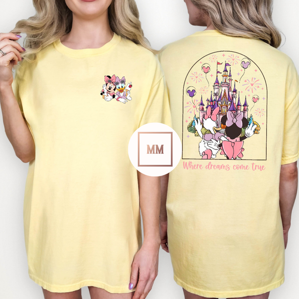 Experience the magic and wonder of childhood with the Banana Where Dreams Come True Tee. Adorned with beloved mouse and duck characters, this shirt is perfect for any young girl's wardrobe. Let your little one's imagination run wild with this playful and whimsical design.