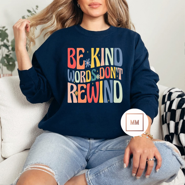 Introducing our Be Kind, Words Don't Rewind Sweatshirt. Stay stylish and spread positivity with this navy sweatshirt featuring colorful writing. Made with comfort and durability in mind, it's perfect for everyday wear. Join the kindness movement and make a statement with our sweatshirt.