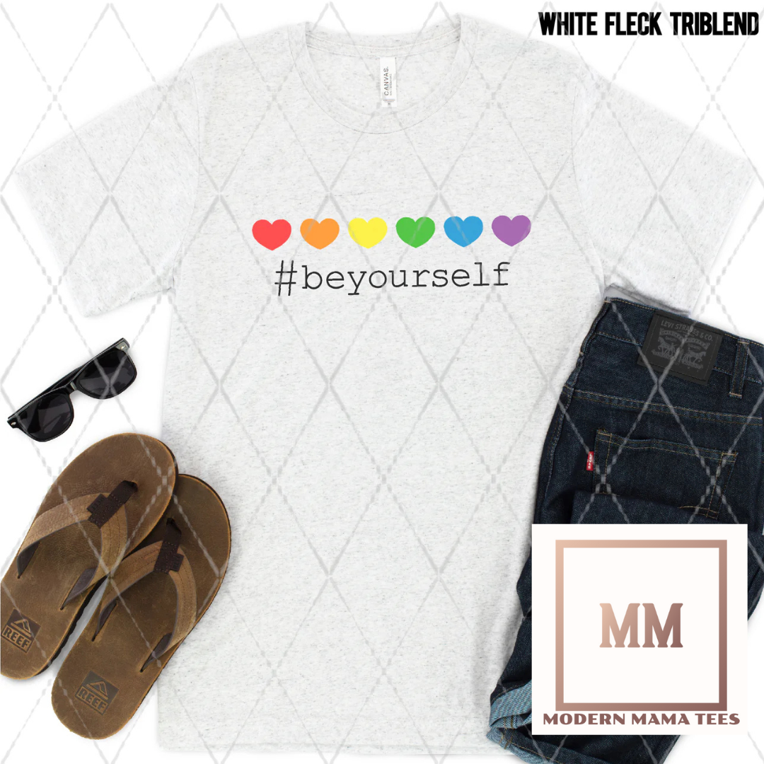 Our Be Yourself Tee is more than just a shirt - it's a celebration of individuality with colorful rainbow hearts. Embrace your unique self with this iconic and empowering garment. Made with quality materials, it's both stylish and comfortable. Show the world who you are with our Be Yourself Tee.