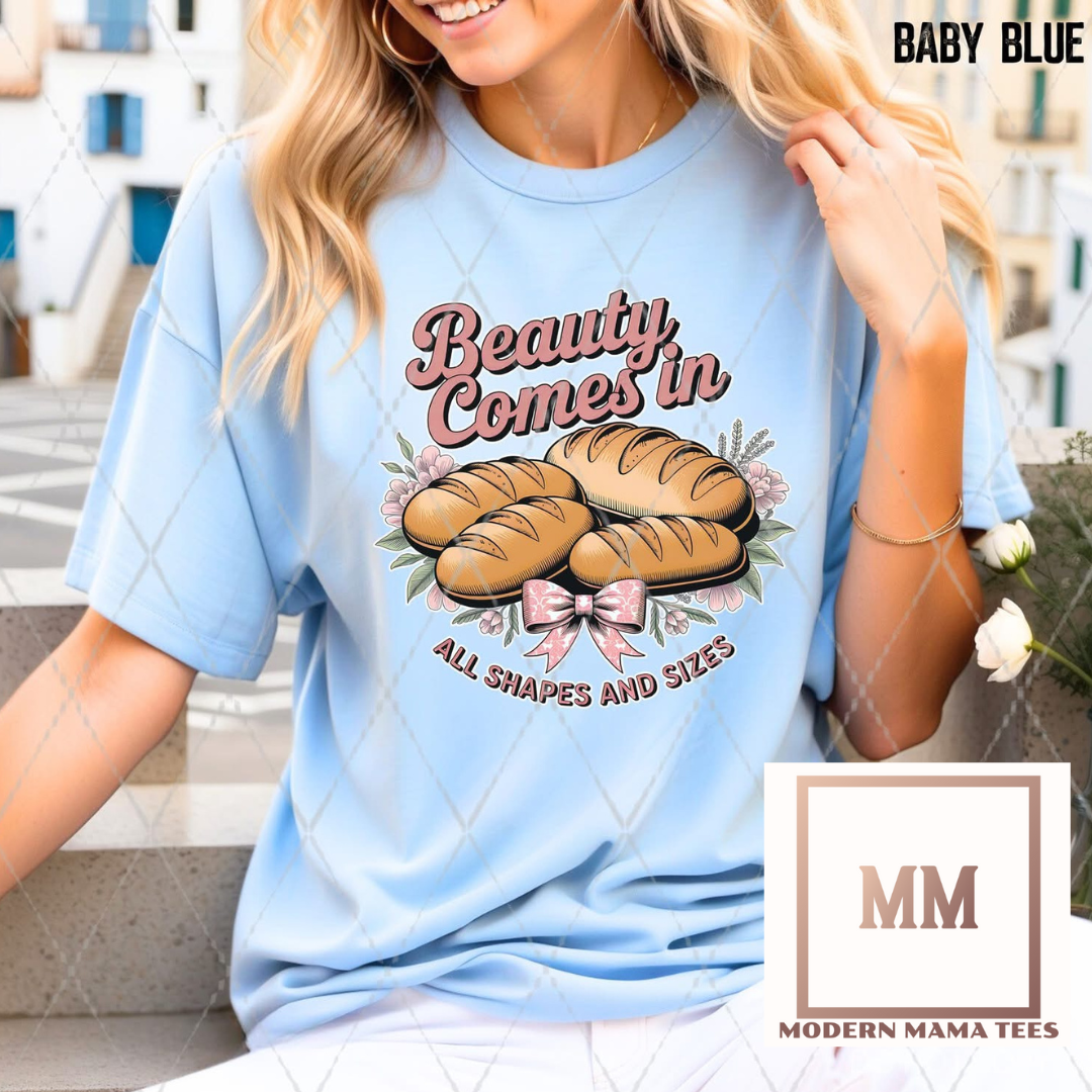 Discover the beauty that comes in all shapes and sizes with our Beauty Comes in All Sizes Tee. Made with soft, comfortable fabric and featuring a charming bread loaf design, this tee celebrates diversity and inclusivity. Embrace your unique beauty with this stylish and meaningful tee.