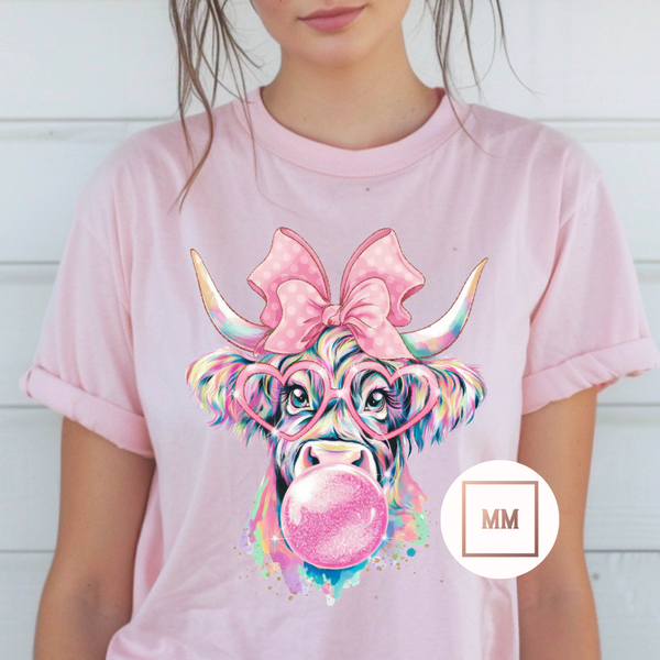 The Bubblegum Cow Tee features a playful design of a pink cow blowing bubbles, adorned with a cute pink bow. Made from high-quality materials, this tee is sure to bring a touch of whimsy to your wardrobe. Perfect for those who love a touch of sweetness in their style.