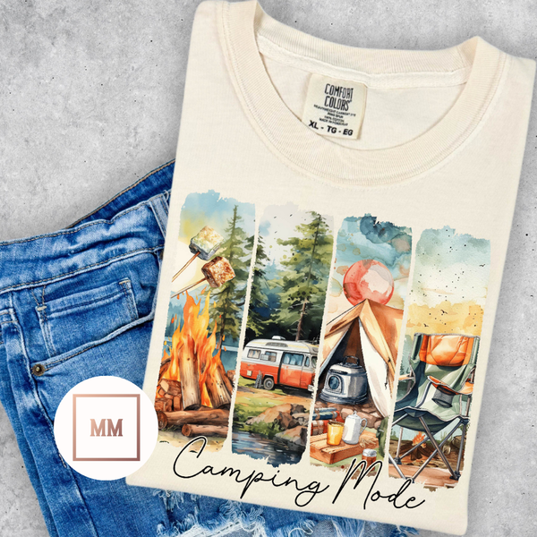 The Camping Mode Tee features four unique watercolor camping scenes, perfect for the outdoor enthusiast. Whether you're roasting s'mores or exploring the wilderness, this tee will keep you comfortable and stylish. Made with high-quality materials, it's perfect for any camping adventure.