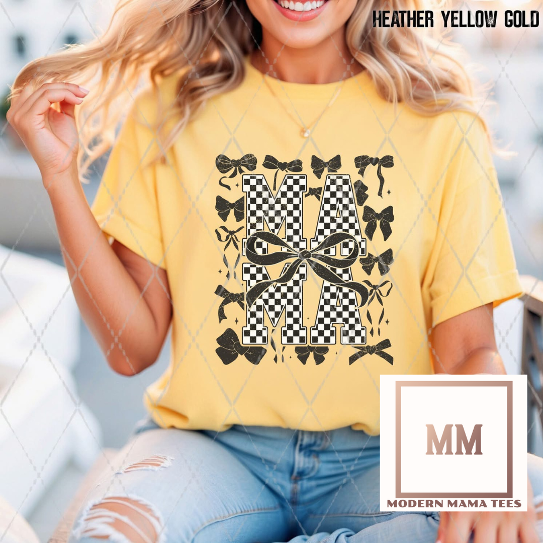 Introducing our Checkered Mama Tee, the perfect addition to any wardrobe. Crafted with a stylish checkered design and beautiful bows, this tee is both trendy and comfortable. With this tee, you'll look and feel your best, making it the ideal choice for any busy mama on the go. Upgrade your closet with our Checkered Mama Tee today!