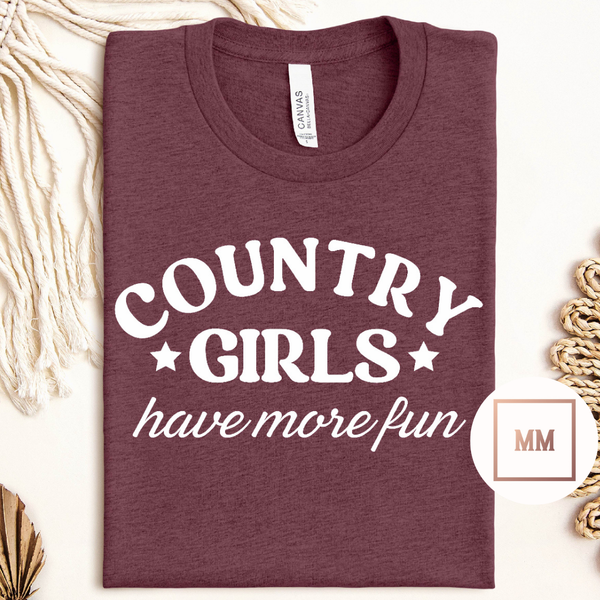 This maroon tee is the perfect addition to any wardrobe. Made with high-quality materials, it provides comfort and style. Show your love for country living with the "Country Girls Have More Fun" design. A must-have for any country girl or fan. Embrace the fun and fashion with this tee.