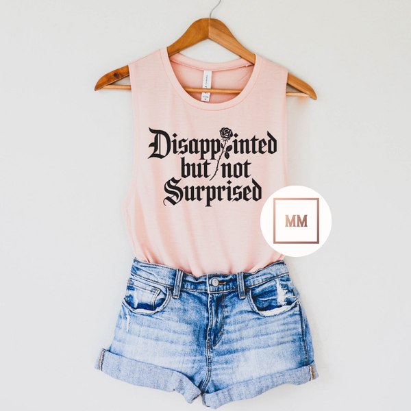 This Disappointed Not Surprised Tank features an elegant rose motif centered on premium fabric, creating a sophisticated statement piece. The strategically placed floral design contrasts beautifully with the wry sentiment, offering a perfect balance of irony and aesthetics. Crafted with a tailored silhouette that flatters the form while providing exceptional comfort, this tank delivers superior breathability for all-day wear while maintaining its structural integrity through multiple washes.