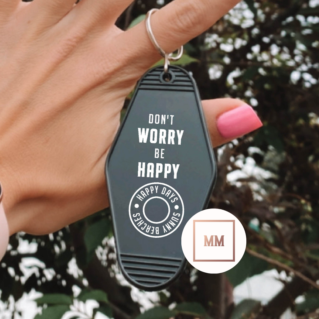 The Don't Worry Be Happy Motel Keychain is the perfect accessory for those seeking sunny days and carefree vibes. With its cheerful phrase, this keychain serves as a daily reminder to let go of worries and embrace happiness. Take a piece of sunny beach life with you wherever you go.