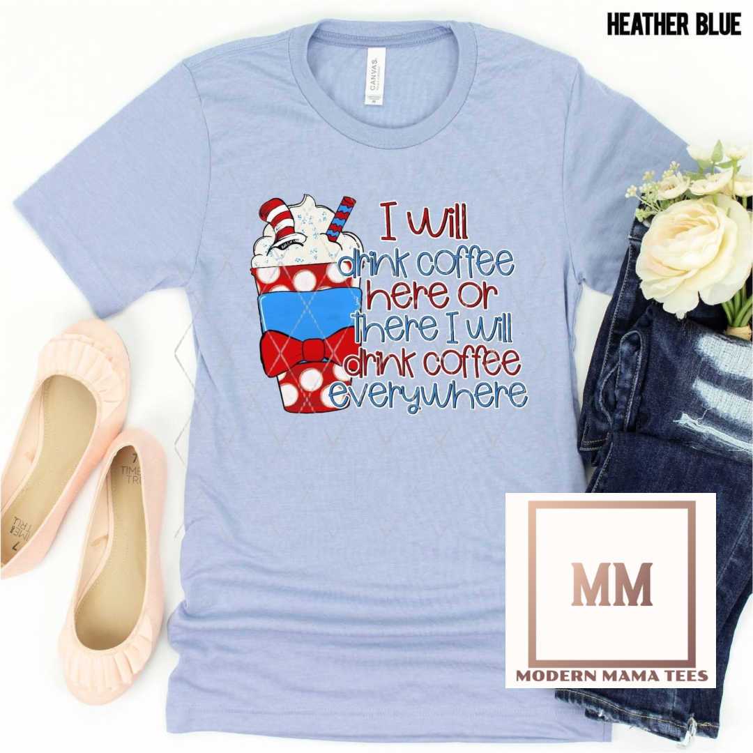 Stay caffeinated and inspired with our Drink Coffee Everywhere Tee, featuring a bold blue design of Dr. Seuss's famous quote. Perfect for coffee lovers, this tee will keep you cozy and stylish wherever you go.