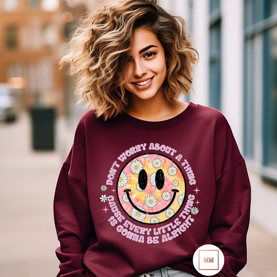 Stay positive and cozy with our "Every Little Thing is Gonna Be Alright" maroon sweatshirt. Featuring a smiley face and daisies, this sweatshirt reminds you to not worry, as everything will be alright. Spread good vibes while staying warm.