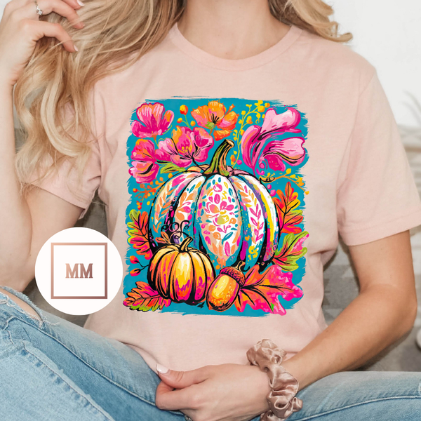 This Fall Pastel Pumpkin Tee features a charming design of pumpkins adorned with delicate flowers and fall leaves. The main pumpkin boasts a lovely pattern, adding a touch of elegance to this seasonal top. Perfect for adding a touch of autumn charm to your wardrobe.