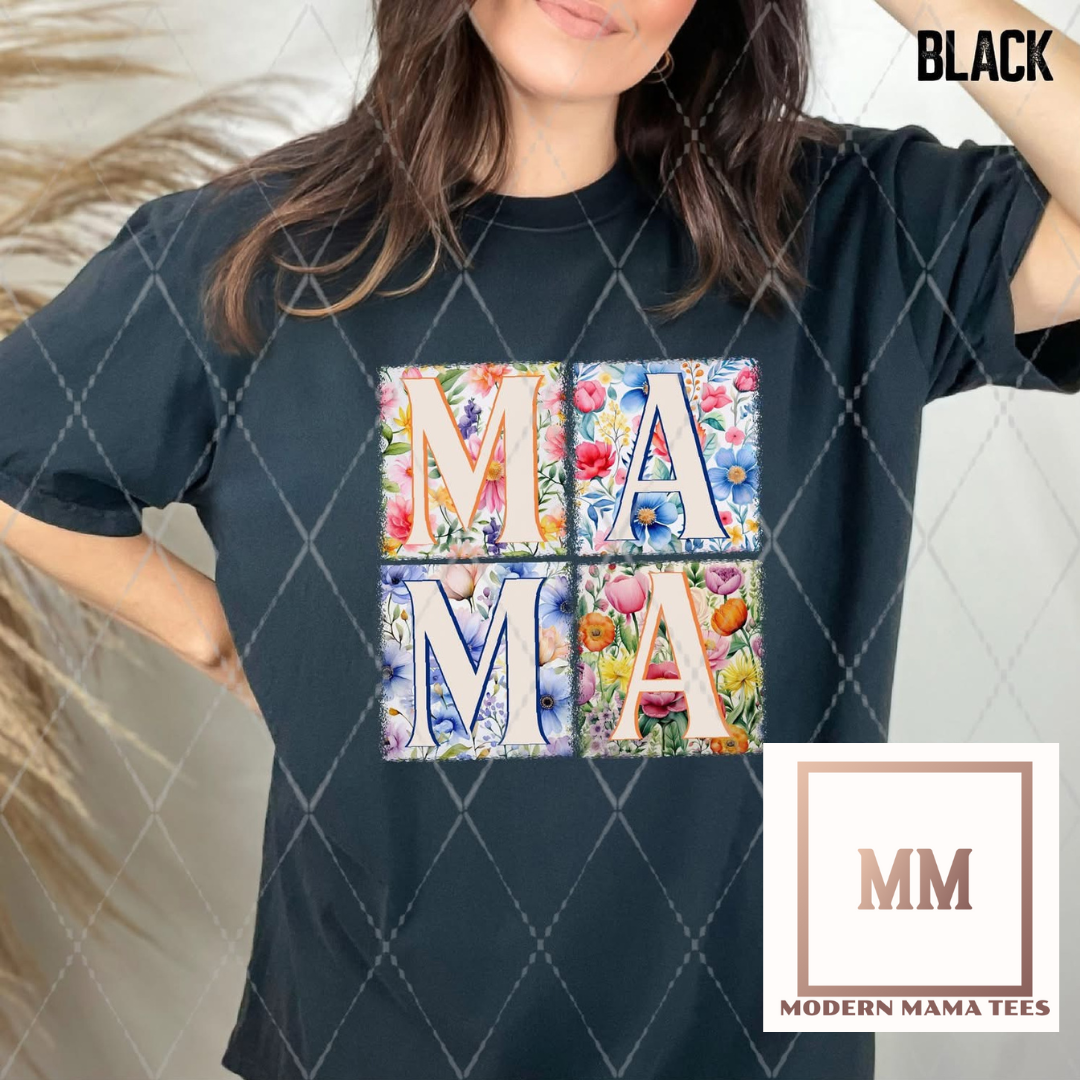 The Flower Fields Mama Tee features a delightful floral design, with vibrant fields and 4 blocks spelling out "MAMA". Embrace motherhood in style with this charming and unique tee. Expertly designed to showcase your love for your little ones.