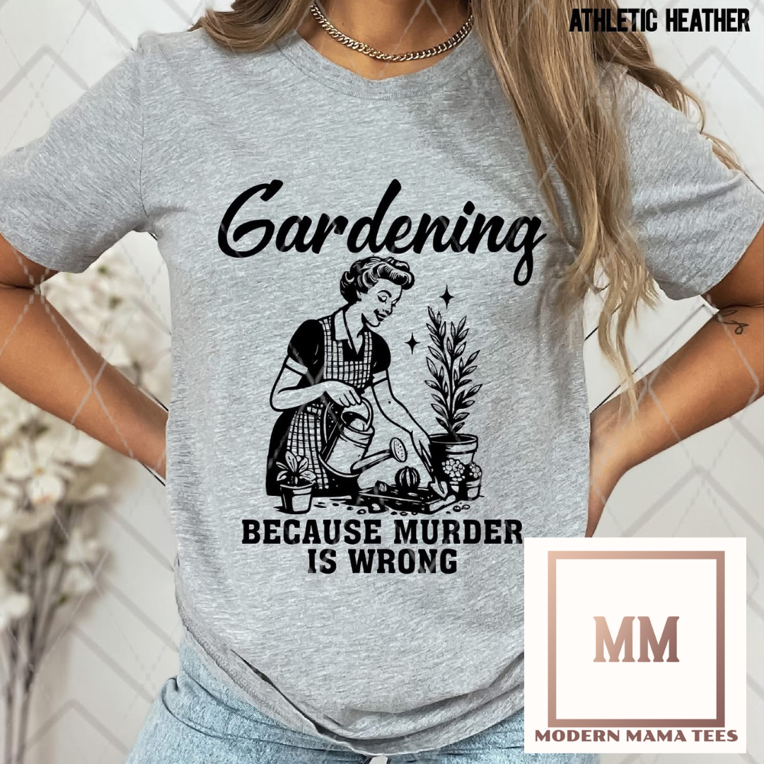 Introducing the Gardening Tee, perfect for any murder-free garden enthusiast. This shirt features a woman watering plants on the front, inspiring you to nurture and grow instead of choosing violence. Made for a comfortable fit, this shirt is perfect for any green-thumb expert.