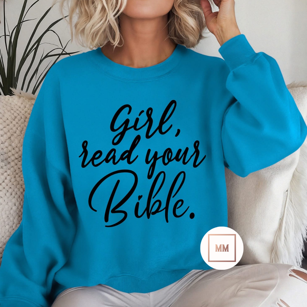 Stay warm and stylish while spreading an important message with our “Girl Read Your Bible Sweatshirt” Made with soft, cozy fabric, it features a bold "Girl, read your bible" graphic in blue. Show your faith and inspire others with this comfortable and empowering sweatshirt.