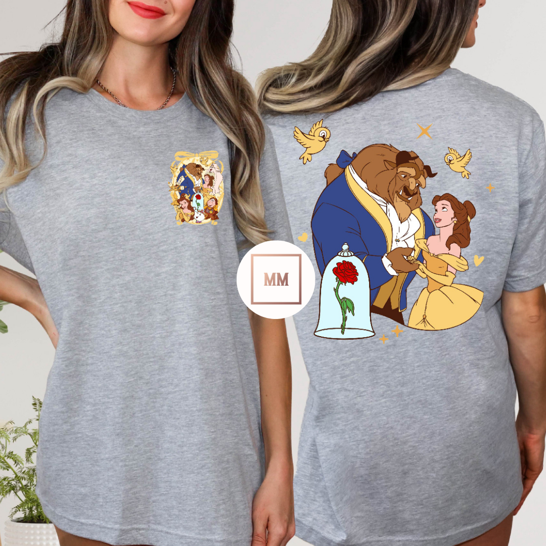 This Grey Beauty Tee showcases a romantic image of a princess and her prince before he turned handsome. The vibrant yellow coloring adds a touch of femininity and pairs well with any outfit. Embrace your inner royalty with this lovely tee.