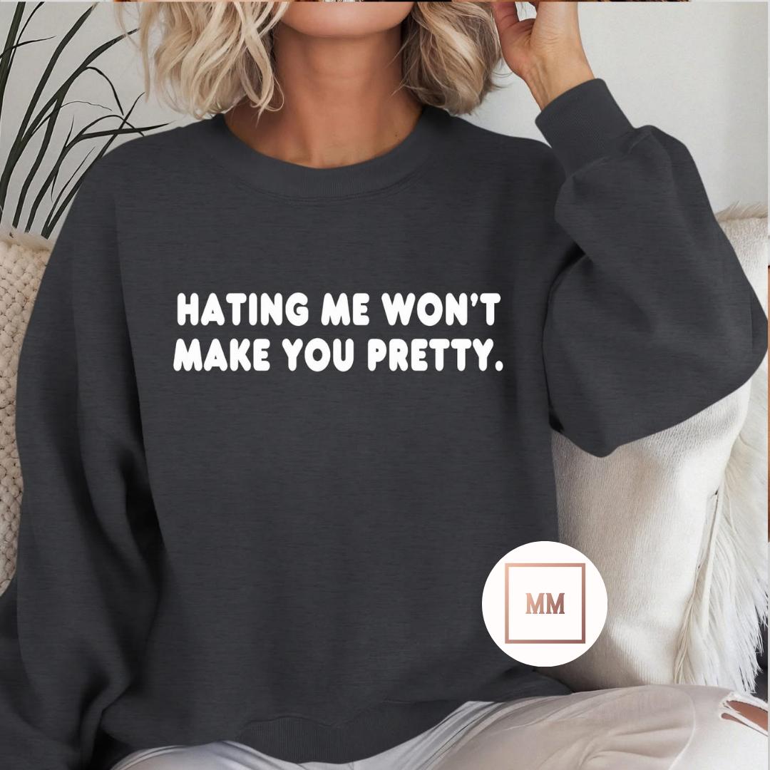 Stay stylish and comfortable in our Dark Grey "Hating Me Won't Make You Pretty" Sweatshirt. Made with high-quality material, this sweatshirt is perfect for any casual occasion. The dark grey color adds a touch of edginess to your wardrobe, while the bold statement serves as a reminder to love yourself just the way you are.