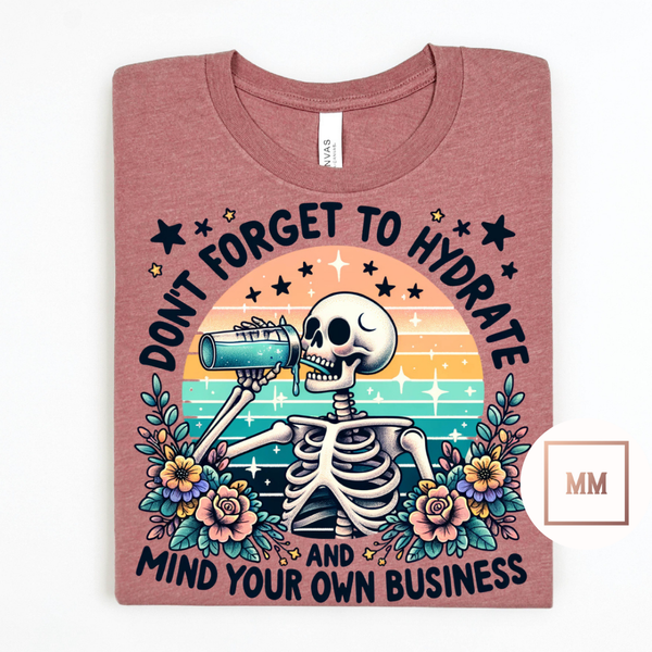 Stay cool and focused with our Hydrate and MYOB Tee. Perfect for hot summer days, this shirt is a gentle reminder to stay hydrated and mind your own business. Keep yourself refreshed while showcasing your independent spirit.