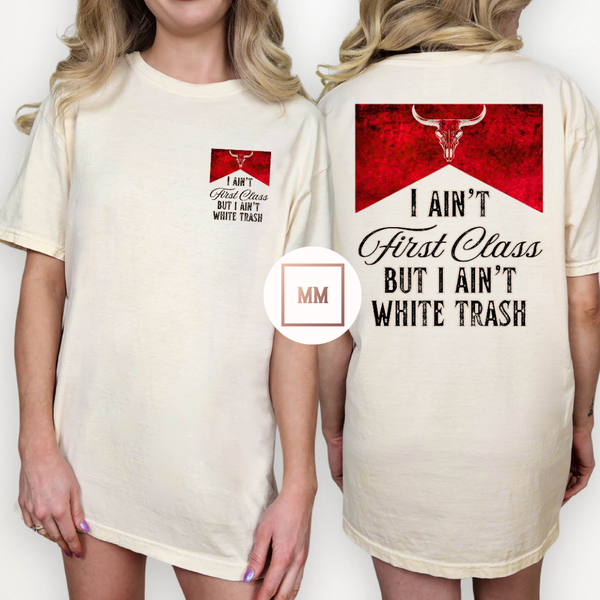 The I Ain't First Class Tee is the perfect way to show off your unique style. With a playful slogan of 'I ain't first class but I ain't white trash' and a small bull design, this tee is sure to make a statement. Made with high-quality materials, it's comfortable and durable for everyday wear. Express your individuality with this one-of-a-kind tee.