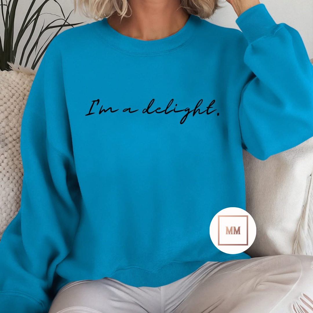 This blue "I'm a Delight" sweatshirt is perfect for showcasing your lighthearted personality. Made with high-quality materials, it provides both comfort and style. With its eye-catching design, it's sure to make a statement. Show off your unique sense of humor in this must-have piece.