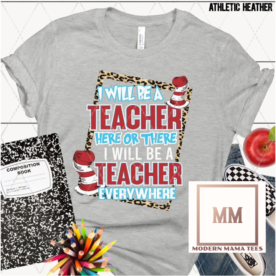 This "I Will Be A Teacher Everywhere Tee" features chic leopard details and a powerful message that reflects a dedicated teacher's spirit. This versatile top can be worn in any teaching environment, making it a perfect addition to any educator's wardrobe.