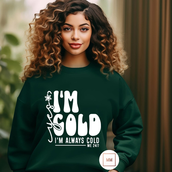 This sweatshirt is perfect for those who are always cold. Featuring the statement "yes I'm cold. I'm always cold 24/7" on the front, it's a great way to express your chilly disposition. Made with comfortable and warm fabric, you'll stay cozy all day long.