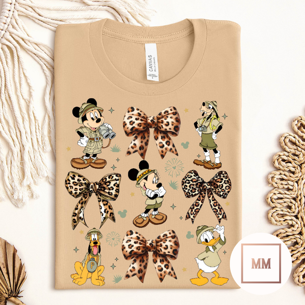 This khalo green tee is made with leopard coquette bows and features your favorite mouse crew, giving it a unique and stylish touch. Crafted with quality and comfort in mind, this tee is perfect for any casual occasion. Make a statement with the Khaki Safari Mick & Crew Tee.