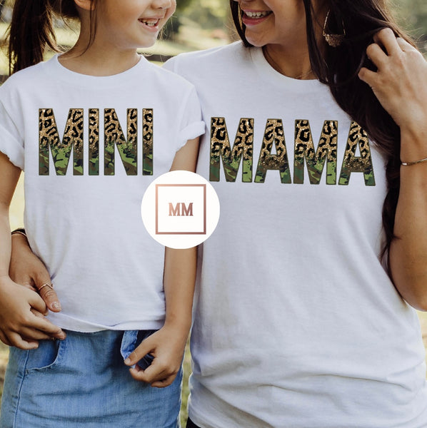 Elevate your mommy-and-me style with our Leopard Camo Mama Tee. Designed for both you and your little one, this matching set features a unique mix of leopard and camo on each letter, adding a touch of playful charm to your outfits. Stand out in style with this must-have tee.