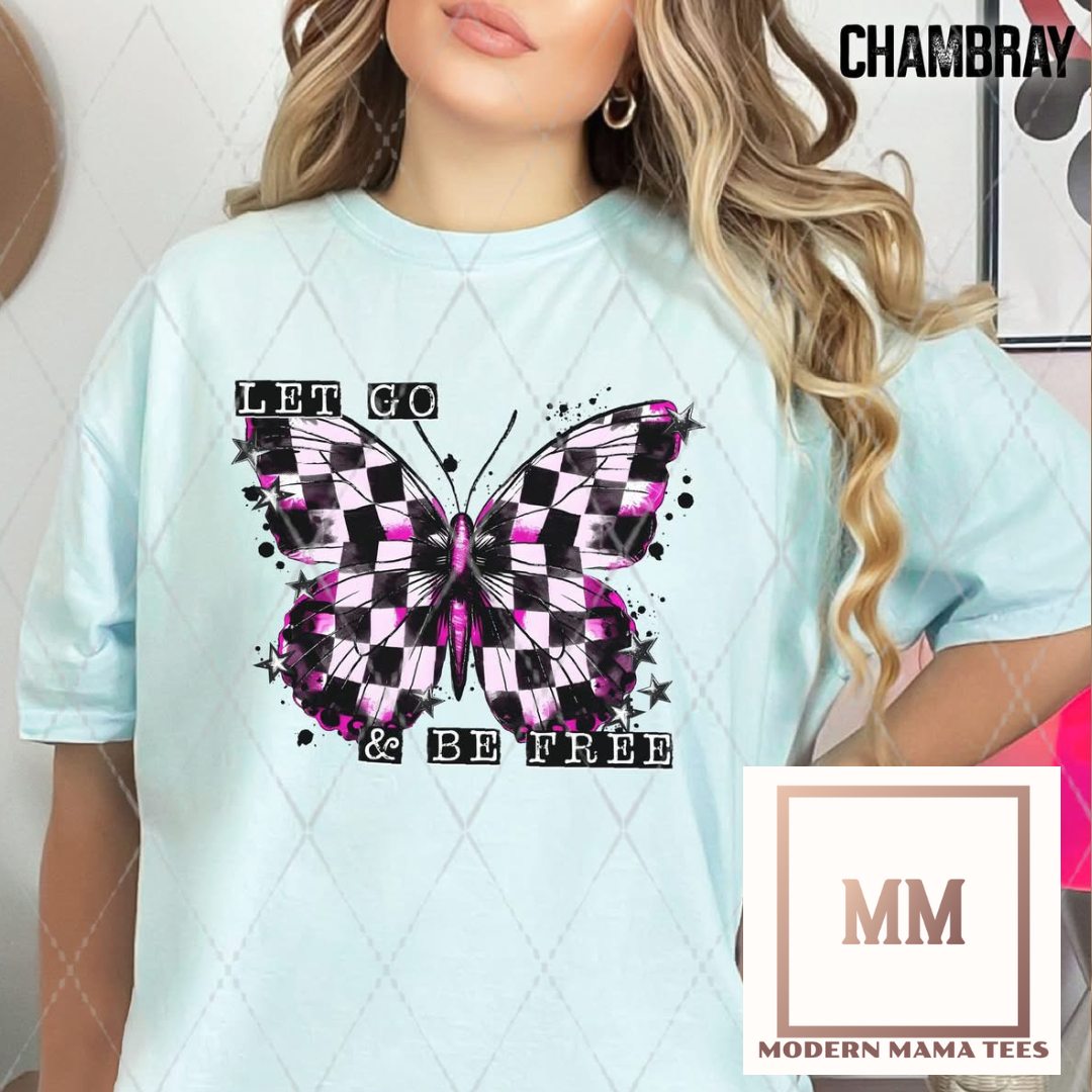 Unleash your inner free spirit with our Let Go & Be Free Tee. Featuring a checkered butterfly design, this tee symbolizes breaking free and spreading your wings. Embrace your independence and fly towards your dreams with confidence in this stylish and empowering shirt.