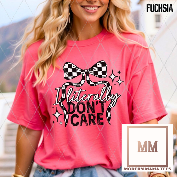 Perfect for those who love to make a statement, the Literally Don't Care Tee features a cute bow and checkered pattern that will surely turn heads. With its carefree attitude, this tee is perfect for casual days and adding a touch of edginess to any outfit. Made for those who confidently express themselves without a care in the world. .