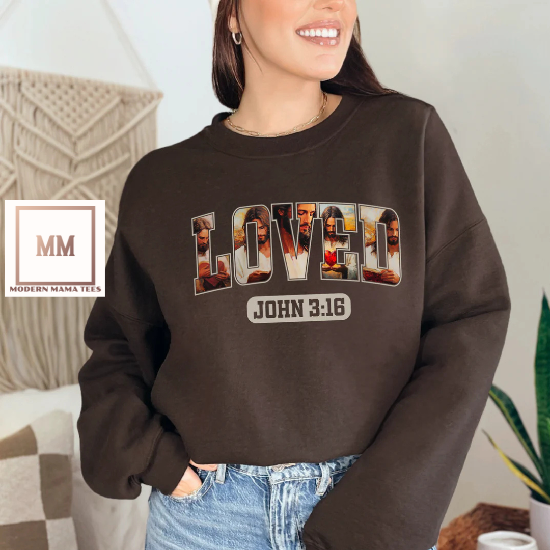 This brown sweatshirt features the scriptural verse John 3:16 with the word "loved" printed on it. The design also includes a subtle image of Jesus within the letters. Embrace comfort and share your faith with this unique and powerful sweatshirt.