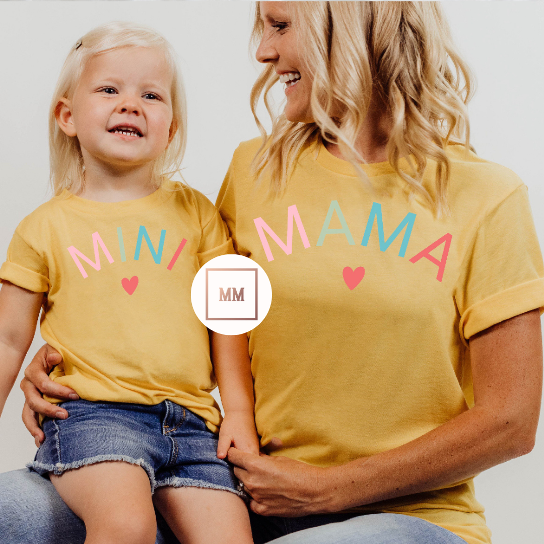 Upgrade your mom style with our Mama Minimalistic Heart Tee. Featuring a small heart on the bottom, this tee comes in spring colors and thin lettering for a minimalistic look. Perfect for matching with your mini's outfit.