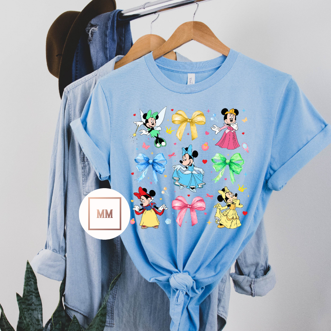 The Mouse Princess Tee is a must-have for any fairy tale lover! Featuring a charming mouse princess adorned in different dresses and bows, this shirt is a beautiful addition to any wardrobe. Perfect for showcasing your royal style with a touch of whimsy.