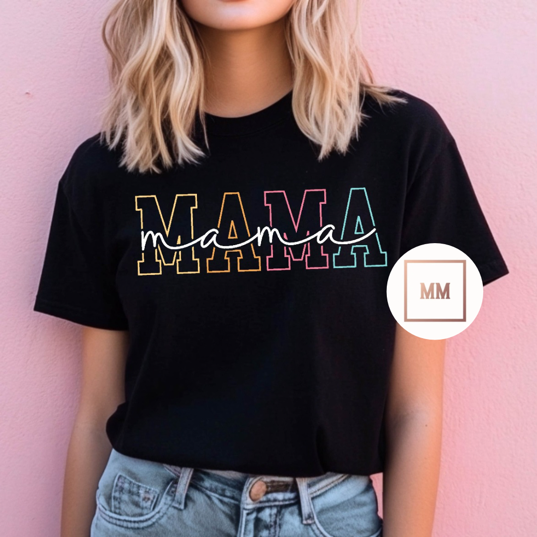 The Outline Mama Tee features the word "mama" written in a beautiful cursive font overlaid on a bold university font, creating a stylish and unique design. This tee is perfect for any proud mama looking to make a statement.