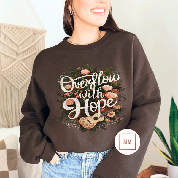 Introducing our newest addition, the Overflow with Hope Sweatshirt. This brown sweatshirt features beautiful flowers and a guitar, symbolizing growth and music. With our positive message of "overflowing with hope", this sweatshirt is a reminder to stay optimistic and inspired.