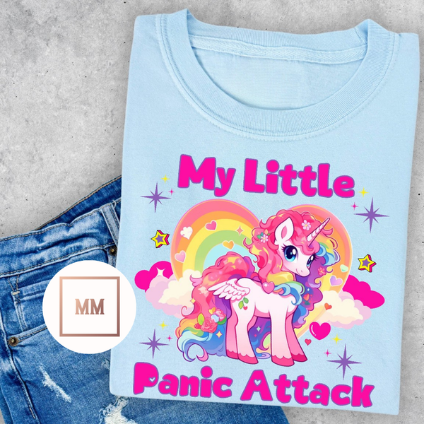 This Panic Attack Pony Tee is perfect for those who appreciate a humorous twist on life's struggles. Featuring a playful combination of pony sunshine and rainbows, this shirt offers a lighthearted approach to panic attacks. Embrace your sense of humor and spread some sunshine with this fun and unique t-shirt.