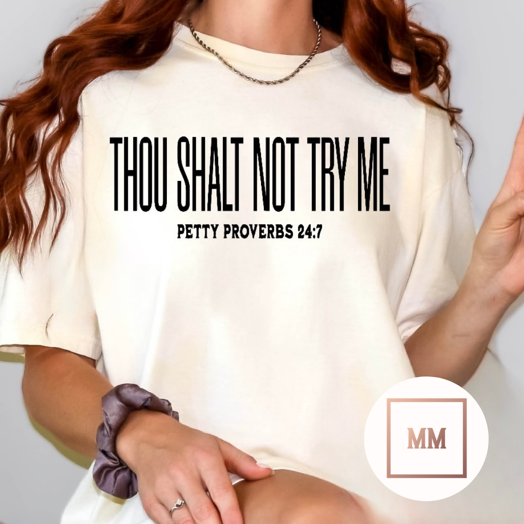 Introducing the Petty Proverbs Tee. With its bold statement "thou shalt not try me", this tee is perfect for those who won't tolerate any nonsense. Made from high-quality fabric, this tee is both comfortable and stylish. Channel your inner confidence and let them know who's boss.