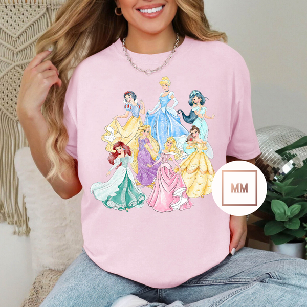 Elevate your style with our comfy White Pretty Princess Tee. Featuring 7 of their favorite princesses in stunning gowns, this tee is sure to impress. Made from high-quality materials, it's both stylish and comfortable. Perfect for any princess-lover.