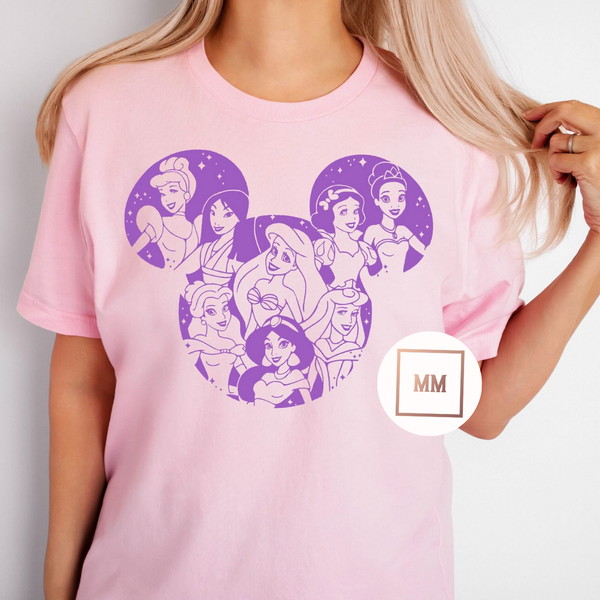 Indulge in a royal experience with our Princess Mouse Ears Tee. Adorned with beautiful princesses and a classic mouse head design, this shirt will make you feel like royalty. Don't just look like a princess, feel like one too!