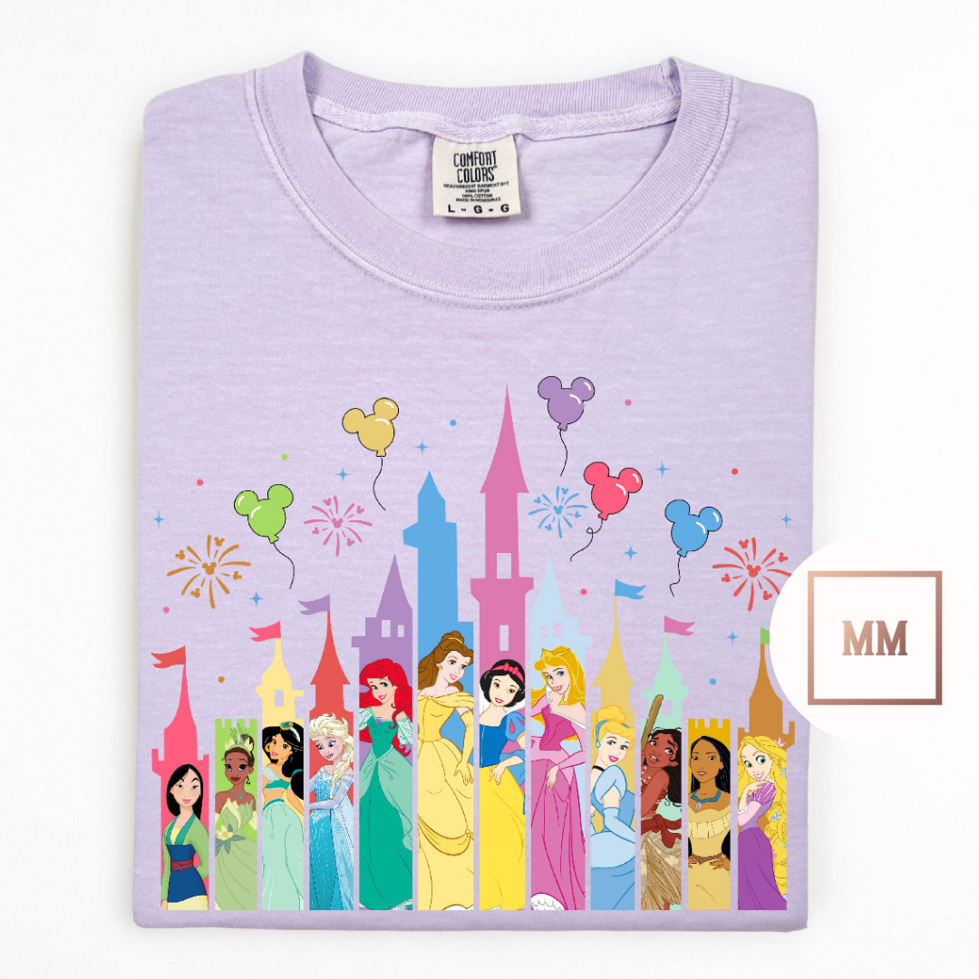 This Purple Princess Castle Tee features a whimsical design with all your favorite princesses, accompanied by a grand fireworks display and charming mouse balloons. Bask in the magical atmosphere and show off your love for princesses.