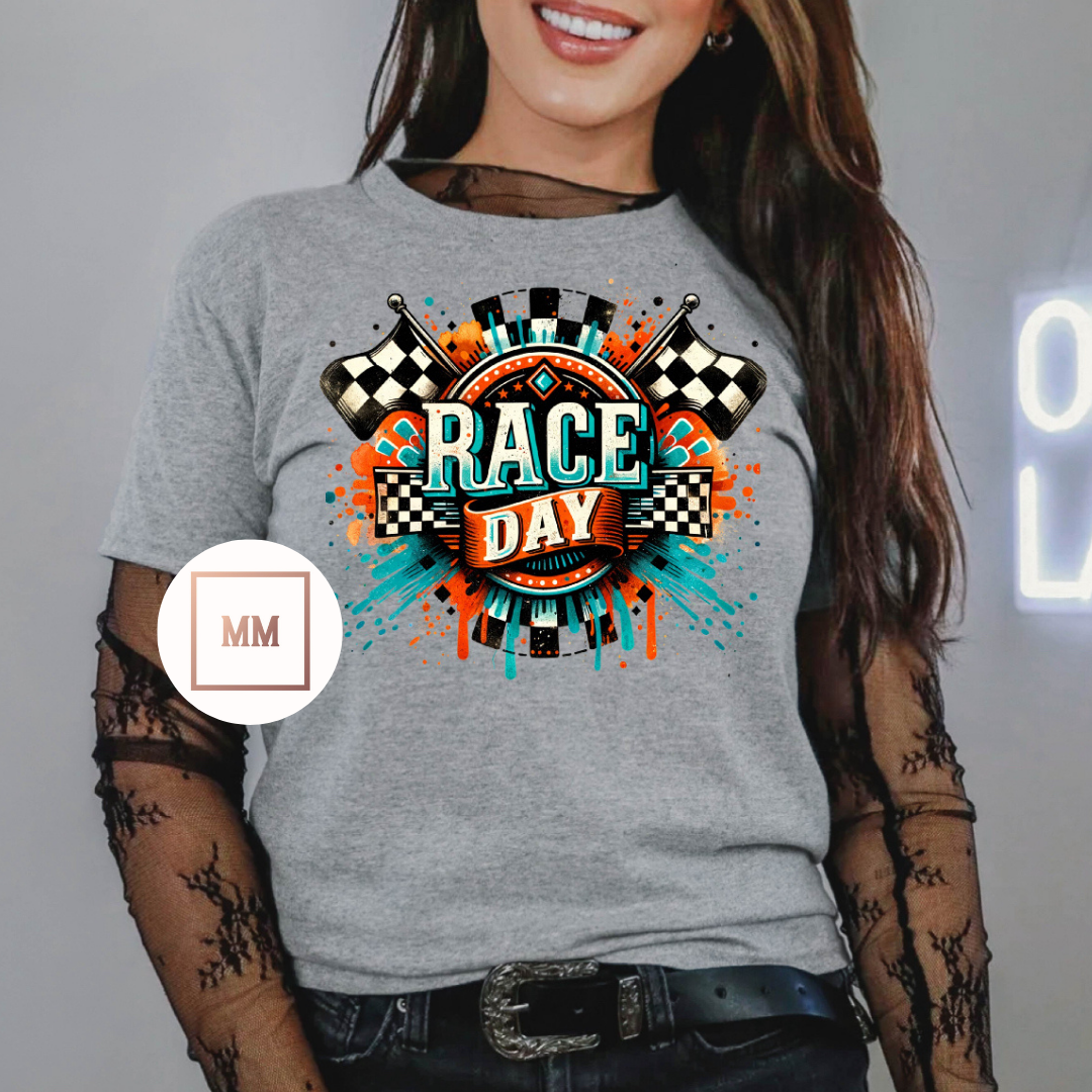 Introducing the Race Day Tee - the perfect addition to your wardrobe for any race day event! Featuring pops of vibrant color and checkered flags, this tee is sure to make a statement. Stay comfortable and stylish while showing your love for racing.