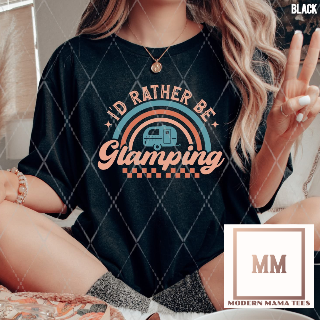 Experience the great outdoors without sacrificing comfort. Our Rather Be Glamping Tee features a small trailer design, perfect for anyone who loves the outdoors but prefers a more luxurious camping experience. With this tee, you can proudly show your love for glamping wherever you go.