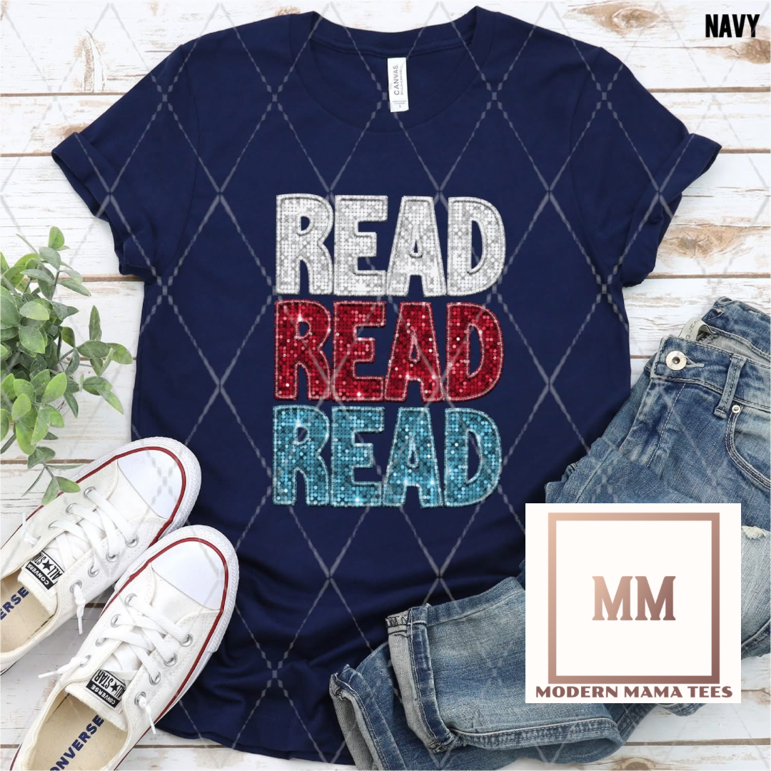 The Navy "read read read" tee features faux glitter letters, making it a stylish and eye-catching addition to any wardrobe. With its comfortable fit and timeless design, this tee is perfect for both avid readers and fashion enthusiasts alike. Show off your love for literature with this must-have piece.