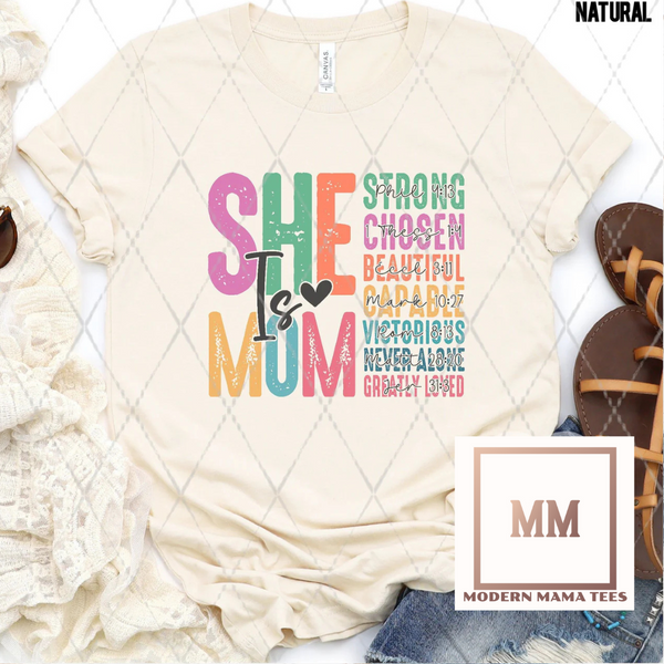 Introducing our She is Mom Tee, part of our faith based collection. Feel empowered and inspired by our unique design and message, made with high quality materials for a comfortable fit. Join us in spreading love and positivity with this tee.