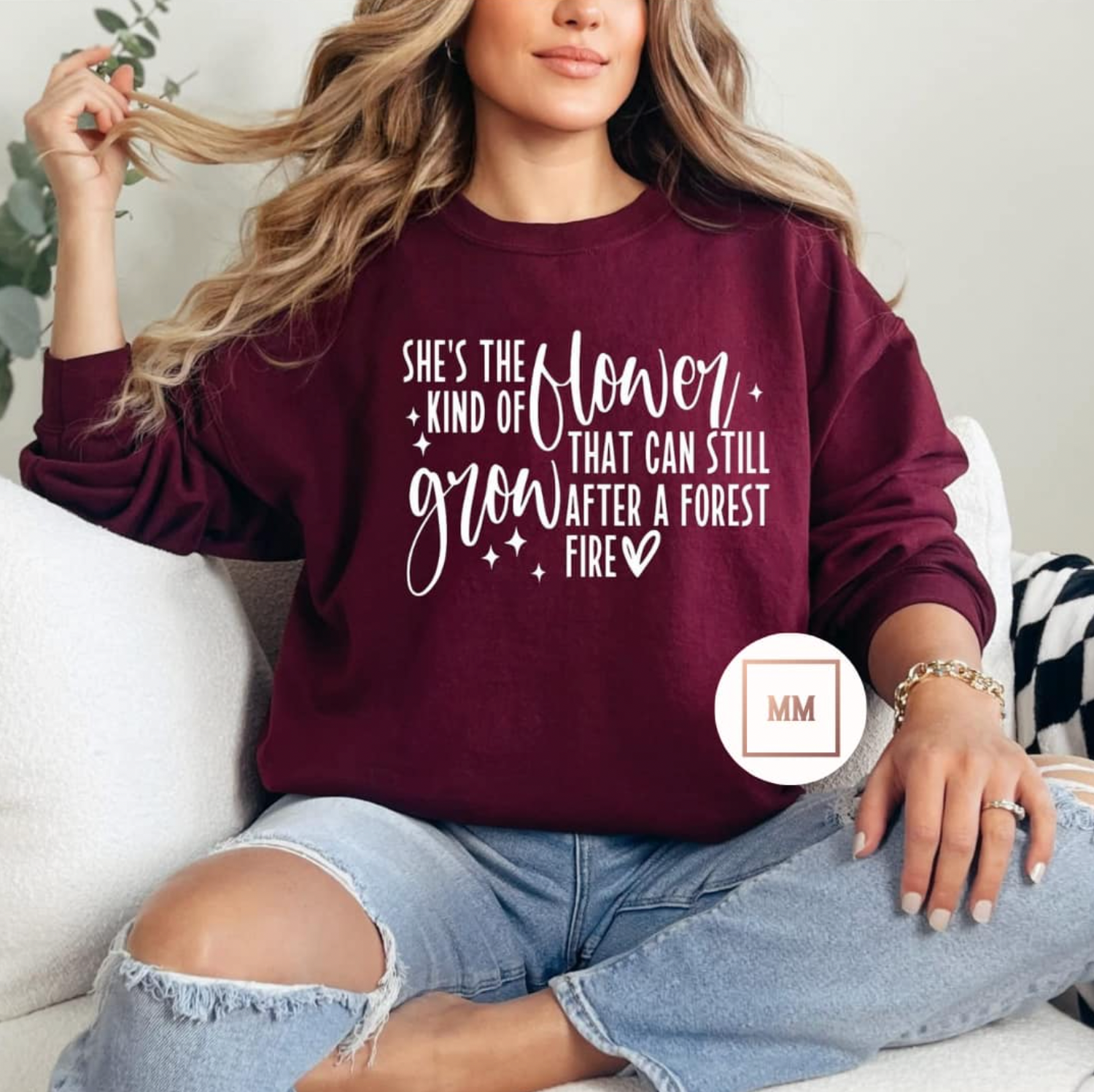 This maroon sweatshirt boldly proclaims "She's the kind of flower, that can still grow after a forest fire." Showcasing strength and resilience, it celebrates the spirit of women. Made with high-quality materials, it is both comfortable and empowering. Perfect for any occasion, this sweatshirt is a must-have for your wardrobe.