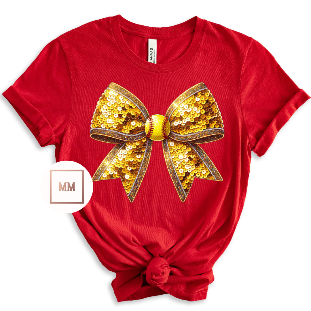 Enhance your softball style with the Softball Bow Tee. Show your love and support for the game with this tee featuring fake sequence designs. Perfect for anyone who plays or wants to show their passion for softball.